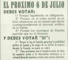 La gente, como siempre sucede, no sabía lo que votaba, y el régimen, como copiando los métodos de los regímenes europeos, enmascaró el referéndum con una vaciedad que arrastró a los votantes: SÍ A FRANCO.
