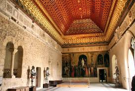 Llamada originalmente Sala de Embajadores, por ser el lugar en el que los invitados esperaban para tener audiencia con la realeza. Recibe su nombre del antiguo artesonado que tenía la forma de casco de barco invertido. La decoración de esta sala fue realizada por la reina Catalina de Lancaster a principios del S. XV durante la minoría de su hijo Juan II de Castilla. Por el friso corren dos leyendas: la superior tiene oraciones medievales en latín y la inferior alude a la persona que mandó hacerla.