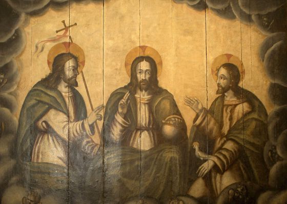 La capilla iba a estar presidida por un conjunto escultórico simbólico compuesto por la paloma del Espíritu Santo, y a ambos lados el Padre y el Hijo. Se colocaría en el centro la imagen de la Virgen recuperada del retablo gótico. El baldaquino colgante que se dispuso sobre el altar mayor tiene una inclinación que permite que desde la entrada se tenga la visión de la Virgen y la Trinidad enmarcados por este elemento simbólico que representa los 7 dones del Espíritu Santo.