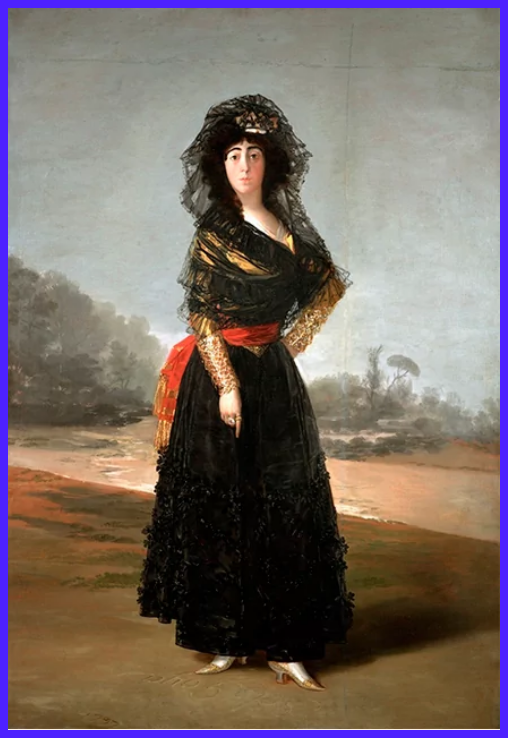 Su auge ornamental tuvo lugar en los siglos XVII y XVIII —que se empezó a utilizar como prenda de lujo en la corte— consolidándose sobre todo como símbolo de distinción de la nobleza, como lo ejemplifican muchos cuadros de época pintados por Francisco de Goya (Mujer joven con mantilla y basquiña o Retrato de una dama con mantilla negra, que se cree era Leocadia Zorrilla, ama de llaves del pintor). Más conocidos son el realizado a la duquesa de Alba o el aguafuerte de la reina María Luisa de Parma. Su utilización en las obras pictóricas impulsó los deseos de renovación de las costumbres puramente castizas frente a la “modernidad francesa”. El uso de la moda de París era considerado una acción antipatriótica. Era una manera de demostrar el rechazo a los galos y a costumbres o injerencias externas.