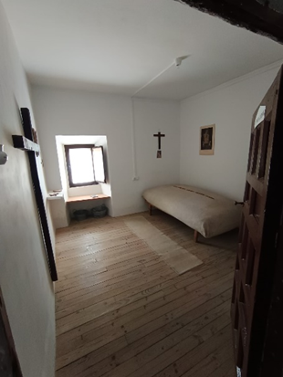 La celda teresiana era pequeña, desnuda y funcional. , compuesta por un jergón de paja de centeno (más resistente y menos húmeda que la de trigo), una manta basta de lana, un taburete, una estera en el suelo, un crucifijo y alguna imagen sencilla, una tinaja pequeña para el agua y una repisa para un libro espiritual.