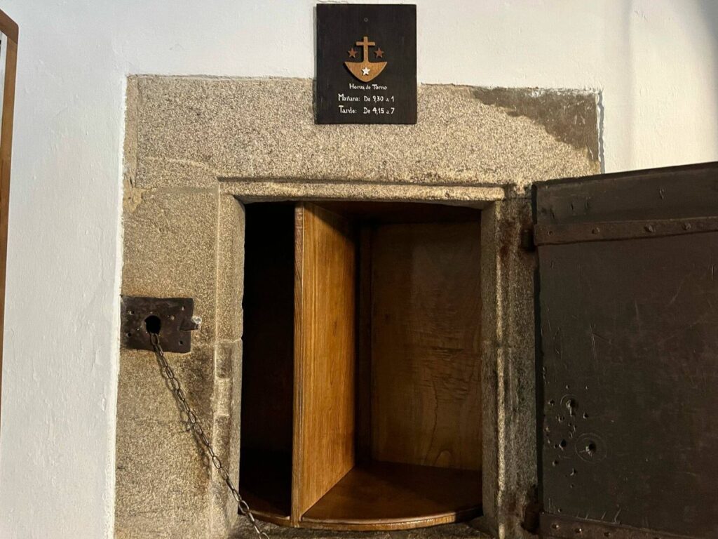 El torno era el mecanismo que permitía recibir y entregar objetos sin romper la clausura. Funcionaba como un pequeño mueble giratorio, siempre atendido por la tornera, que nunca veía a la persona del exterior.