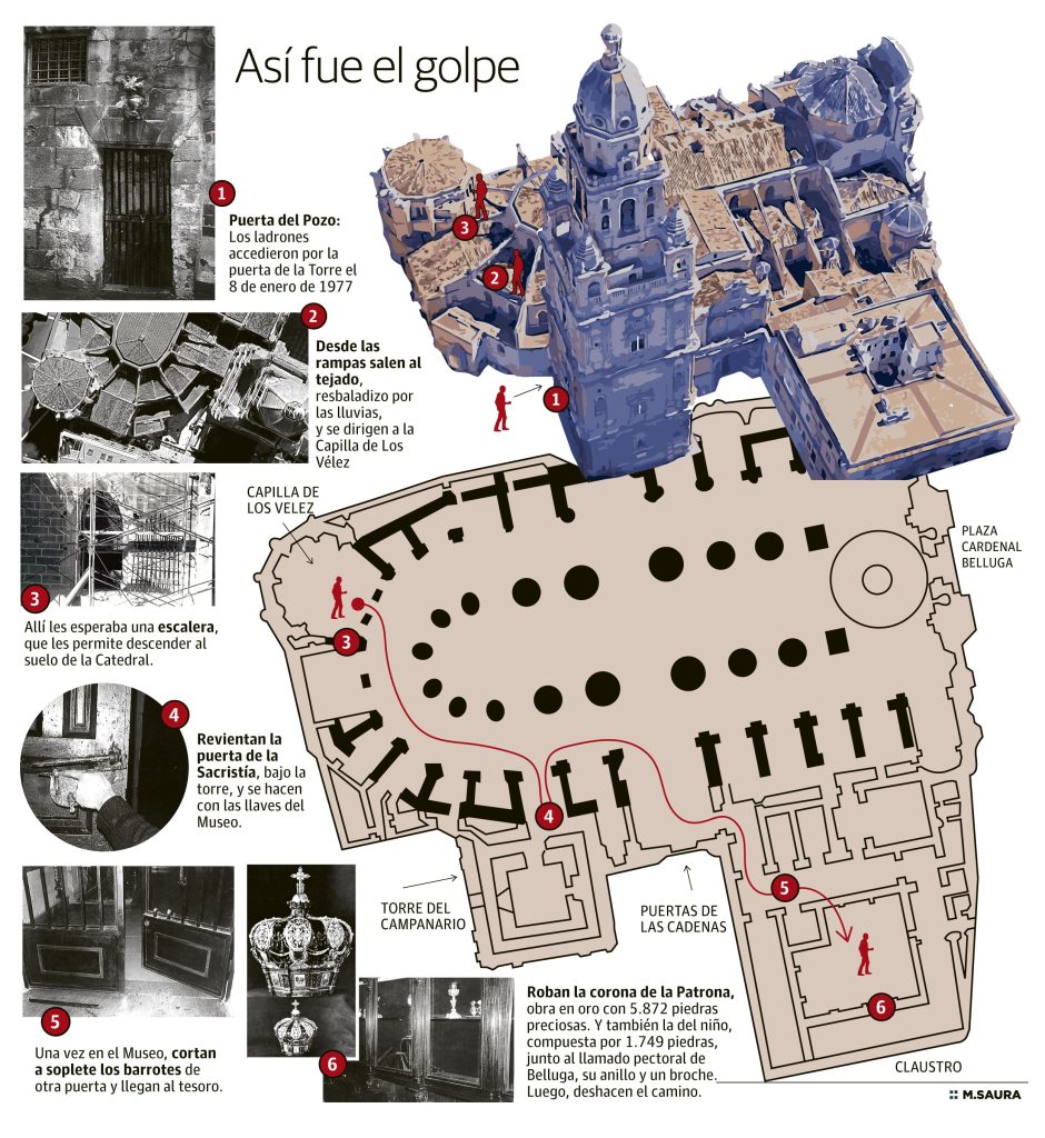 La madrugada del 8 de enero de 1977 llovía con furia mediterránea. Bajo el aguacero, dos ladrones (supuestamente) forzaron la cancela de la Puerta del Pozo de la torre de la catedral, ascendieron por las rampas hasta el segundo cuerpo y desde un ajimez pasaron a los tejados para marchar en dirección a los andamios que cubrían la capilla de los Vélez, que en ese momento se encontraba en obras. Desde allí, se colaron por un ventanuco, bajaron por una escalera de caracol y una vez dentro, sin alarma ni vigilante en el interior que les molestara, accedieron al interior de la catedral, entraron en la sacristía, se hicieron con las llaves del museo y, ayudados por un soplete, cortaron los barrotes que protegían el tesoro de la Virgen.