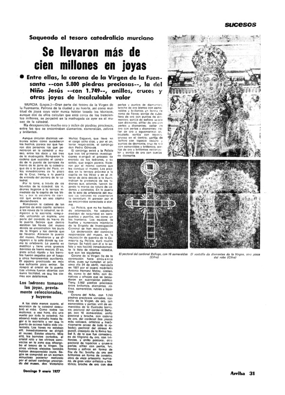 <<Las investigaciones quedaron bajo la dirección del comisario Maximino Conesa. Pero apenas dieron fruto. O eso se contó entonces. Solo trascendió que dos individuos habían entrado de madrugada al templo por la puerta de la Torre. Desde las rampas de subida y a través de un ventanuco pasaron al interior, cortaron los barrotes del museo y perpetraron el robo>>. (Antonio Botías, La Verdad).