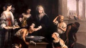 La peste de 1649 permitió la revitalización de la Hermandad de la Caridad, con la incorporación de nuevos hermanos, pero fue el ingreso de Miguel Mañara, heredero de una acaudalada familia de comerciantes de origen corso, y su elección como hermano mayor en diciembre de 1663, impulsó la conclusión de las obras de la capilla de San Jorge situada en las Reales Atarazanas, quien el responsable de elegir a Murillo y Valdés Leal, encargados de las labores pictóricas, Bernardo Simón de Pineda para la arquitectura de los retablos y Pedro Roldán a cargo de la escultura. La ilustración de las obras de misericordia, relacionado cada uno de ellos con una obra de misericordia, La curación del paralítico, visitar a los enfermos; San Pedro liberado por el ángel, redimir a los cautivos; Multiplicación de los panes y los peces, dar de comer al hambriento; El regreso del hijo pródigo, vestir al desnudo; Abraham y los tres ángeles, dar posada al peregrino; y Moisés haciendo brotar el agua de la roca de Horeb, dar de beber al sediento, pueden identificarse con los seis cuadros de Murillo que colgaban de los muros de la nave de la iglesia por debajo de la cornisa, formando otra de las series capitales de la etapa madura del pintor siendo cuatro de ellos fueron robados por el mariscal Soult durante la guerra de Independencia y se encuentran actualmente dispersos en diferentes museos, conservándose en su lugar únicamente los dos mayores que se situaban en el crucero.