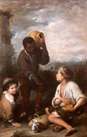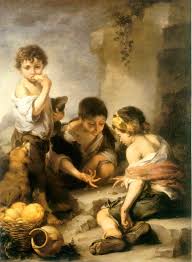 Cuadros como Dos niños comiendo de una tartera y Niños jugando a los dados no parecen responder a otra intención que la de retratar con tono amable a grupos de niños que manifiestan su alegría en el juego o comiendo golosos, y que son capaces de sobrevivir con sus limitados recursos gracias a la vitalidad que les otorga su propia juventud. son Invitación al juego de pelota a pala, que refleja las dudas del niño enviado a hacer algún recado cuando otro, de aspecto pícaro, le invita a participar en el juego. Y el llamado Tres muchachos o Dos golfillos y un negrito, un niño negro con un cántaro al hombro, en el que Murillo podría haber retratado a Martín, su esclavo negro atezado, nacido hacia 1662, llega hasta donde se encuentran otros dos muchachos dispuestos a merendar y con gesto amable les pide un pedazo de la tarta que van a comer, a lo que uno de ellos reacciona divertido en tanto el que tiene la tarta intenta ocultarla entre sus manos con gesto temeroso.​