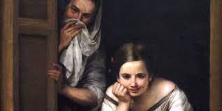 La obra Cuatro figuras en un escalón, se trata de una escena de género inusual, sin precedentes en la pintura española. Aunque el tema de la obra es discutido, podría representar a una alcahueta. Los personajes se encuentran en un zaguán, un espacio cubierto entre el interior de la casa y el exterior que crea un ambiente penumbroso. Es un tema debatido, especialmente en interpretaciones a partir del siglo XX. Una de ellas señala que se trata de una escena familiar, con la anciana despiojando al niño, pero algunas fuentes indican que podría tratarse un burdel, interpretando a la vieja con una alcahueta por el paño sobre su cabeza, mientras que la joven que se levanta el velo simbolizaría la falta de fidelidad matrimonial. A su vez, la obra retrataría la degradación moral de los sujetos, cuyo objeto es el niño del pantalón roto, aunque esta interpretación es discutida, teniendo en cuenta la mentalidad religiosa del pintor.