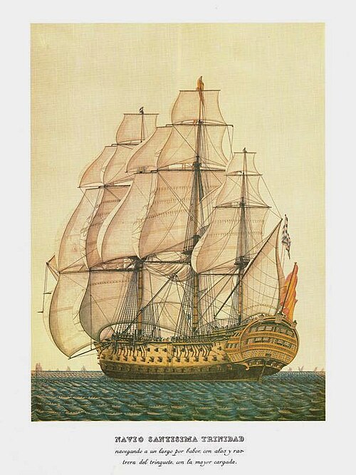 En aquel combate, el Trinidad llevaba enarbolaba la insignia del jefe de escuadra don Baltasar Hidalgo de Cisneros, segundo del general Gravina. Al inicio logró imponerse frente al Victory, buque insignia del almirante Nelson, que intentaba cortar la línea entre él y el francés Bucentauro. La maniobra británica fracasó en un primer momento, pero el Temeraire y el Neptune acudieron en su auxilio, rompiendo el primero la línea y situándose por estribor del Trinidad, mientras el Neptune lo cercaba por babor.