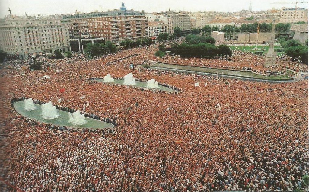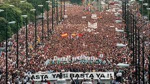 Las cuarenta y ocho horas de espera, después de emitido el ultimátum, fueron una tortura para Miguel Ángel y un suplicio para los españoles de bien. Las multitudinarias manifestaciones se celebraron en todas las capitales de la nación, y los llamamientos a los secuestradores, y auto anunciados asesinos, surgieron de todos los estamentos, instituciones, asociaciones…, fue un clamor nacional la respuesta del “no” al chantaje etarra. Nadie proclamó la conveniencia de un acercamiento de presos, con claudicación del gobierno, al contrario; al chantaje se respondió con la fortaleza de la libertad. Como un solo hombre España no solamente gritó no a la coacción, sino que frases como “Miguel Ángel somos todos” o “ETA aquí está mi nunca” resonaron por todas sus calles. Estaba surgiendo el “espíritu de Ermua”.